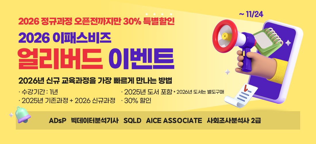 공지사항+ 더보기 [11월 2일 ADsP 시험대비] 2시간만에 끝내는...2025-10-15AICE 20% 시험응시권 할인 안내2025-09-192025 이패스 AI능력시험 AICE Associa...2025-06-19[1인당 35만원 지급!!] 2025 평생교육이용권...2025-06-12 업데이트 안내+ 더보기 2025년 6월 19일(목요일) 업데이트 안내2025-06-192025년 6월 16일(월요일) 업데이트 안내2025-06-172025년 6월 12일(목요일) 업데이트 안내2025-06-172025년 6월 9일(월요일) 업데이트 안내2025-06-17 BEST 수강후기+ 더보기 빅분기 11회 필기 합격수기2025-09-30빅분기 11회 필기 합격후기2025-09-2358회 SQLD 합격수기2025-09-122025 2회 사회조사분석사 2급 실기 합격 후기 !!2025-09-12 데이터분석 자격증 Track 프로 일잘러 인기과정 프로 일잘러 무료 영상+ 더보기 놓치기 아까운 이벤트+ 더보기