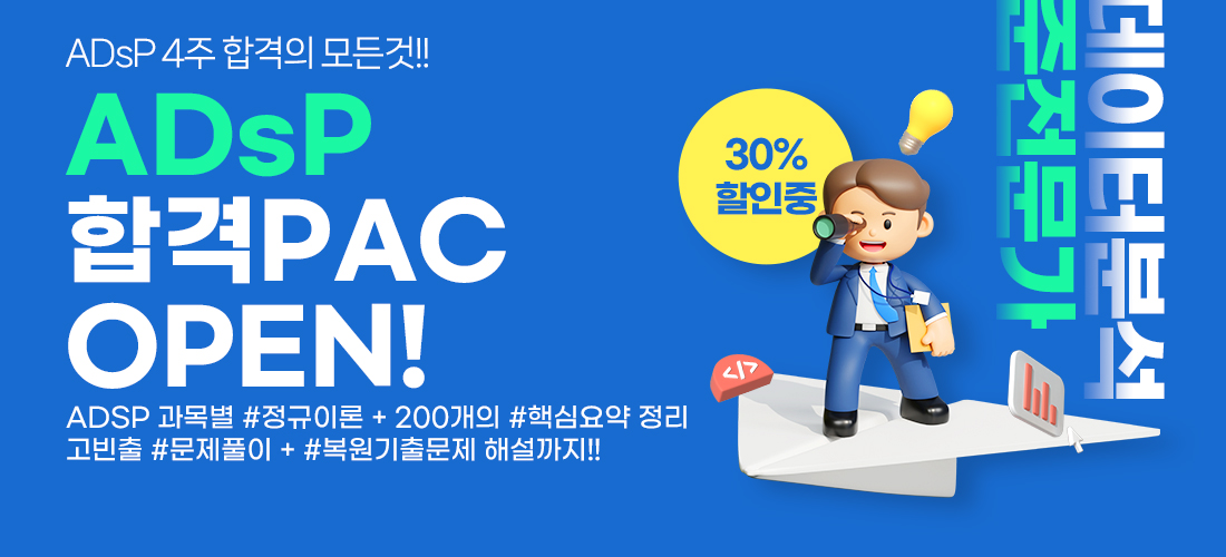 공지사항+ 더보기 [11월 2일 ADsP 시험대비] 2시간만에 끝내는...2025-10-15AICE 20% 시험응시권 할인 안내2025-09-192025 이패스 AI능력시험 AICE Associa...2025-06-19[1인당 35만원 지급!!] 2025 평생교육이용권...2025-06-12 업데이트 안내+ 더보기 2025년 6월 19일(목요일) 업데이트 안내2025-06-192025년 6월 16일(월요일) 업데이트 안내2025-06-172025년 6월 12일(목요일) 업데이트 안내2025-06-172025년 6월 9일(월요일) 업데이트 안내2025-06-17 BEST 수강후기+ 더보기 2025. 10. 25 비전공자 취준생의 AICE ...2025-11-10빅분기 11회 필기 합격수기2025-09-30빅분기 11회 필기 합격후기2025-09-2358회 SQLD 합격수기2025-09-12 데이터분석 자격증 Track 프로 일잘러 인기과정 프로 일잘러 무료 영상+ 더보기 놓치기 아까운 이벤트+ 더보기